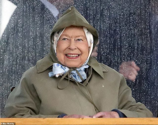 Nữ hoàng nở nụ cười hạnh phúc đội mưa đi gặp chắt trai mới sinh. (Ảnh: Max Mumby)