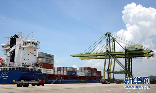 Tàu container ở cảng Muara ngày 17/4/2015. Ảnh: Xinhua