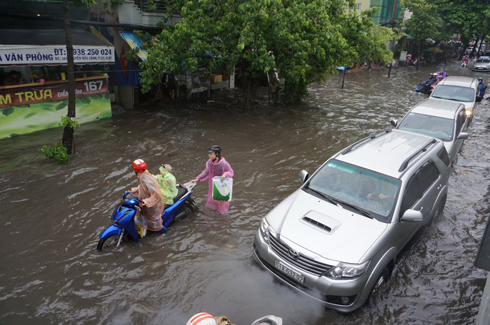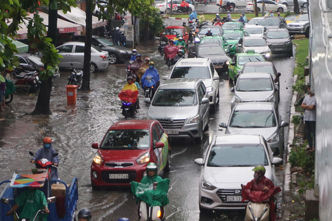Trận mưa kéo dài gần 1 giờ và tại một số khu vực như quận 2, Bình Thạnh..., nước như trút khiến hàng loạt tuyến đường ngập sâu.