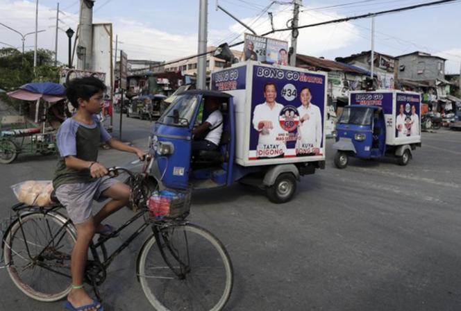 Những chiếc xe dán poster vận động bầu cử chạy quanh quận Tondo hôm 9/5 ảnh: AP