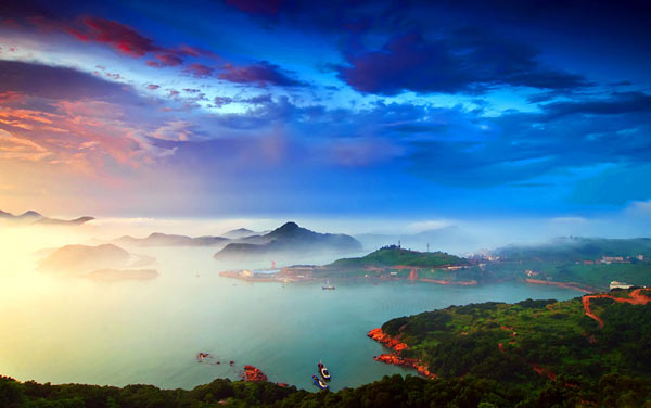 Đồi Vị Tưởng được coi là nơi linh thiêng của mặt trời mọc ở Hạ Phố. Bước lên núi, du khách sẽ bị sốc trước cảnh biển mênh mông như nối liền đường chân trời và khung cảnh hoa mỹ của bãi bồi được nhuộm bởi những đám mây màu hồng.