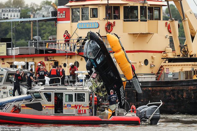Đội cứu hộ trục vớt chiếc trực thăng từ sông Hudson lên (Ảnh: Getty)