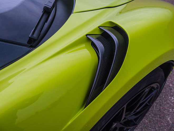 Với cản trước lớn hạ thấp, sát với mặt đường cùng thiết kế cửa dạng cắt kéo, đuôi gió thể thao, McLaren 600LT Spider dễ dàng chiếm được cảm tình của người đối diện ngay từ cái nhìn đầu tiên. Không chỉ khoác lên mình bộ cánh thể thao đầy mạnh mẽ phiên bản mui trần 600LT Spider còn gây ấn tượng với các hốc hút gió lớn ở đầu xe, thân xe.