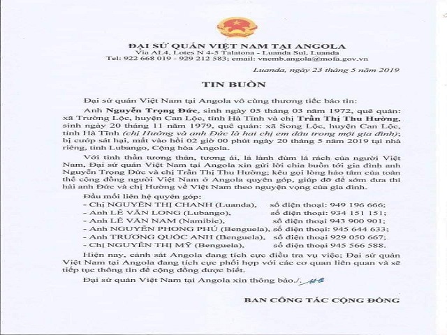 Trong thông báo, Đại sứ quán Việt Nam tại Angola cũng đồng thời kêu gọi cộng đồng người Việt Nam tại Angola quyên góp, giúp đỡ để đưa thi thể anh Đức và chị Hường về Việt Nam theo nguyện vọng của gia đình.