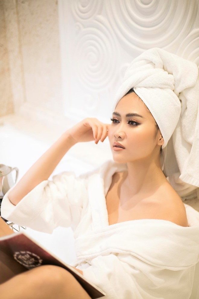 Mới đây, Á hậu 2 Miss All Nations 2019 (Hoa hậu các quốc gia 2019) - Trúc Ny vừa tung ra bộ ảnh gợi cảm. Trong ảnh, người đẹp Khánh Hòa chọn lối trang điểm sắc sảo, quyến rũ, khoác áo choàng tắm hờ hững khoe vòng một gợi cảm.