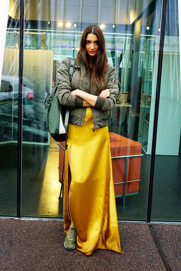 Cá tính hơn khi mix cùng áo jacket và giày thể thao màu xanh rêu.