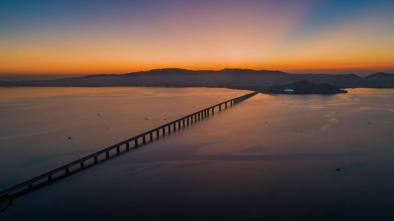 Cây cầu dài gần 7 km nối thành phố Quy Nhơn với bán đảo Phương Mai, từng là cầu vượt biển dài nhất Việt Nam. Nếu chỉ có một ngày ở Quy Nhơn, bạn nên dậy sớm để đón những ánh bình minh đầu tiên giữa biển trời rộng lớn với bầu không khí trong lành trên đầm Thị Nại. Ảnh: Trung Phạm.