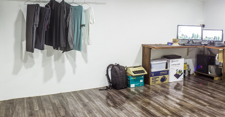 Gác xép nơi làm việc của Bắc chỉ treo vài bộ quần áo đi làm và bộ máy tính làm việc. Ảnh: H.N.