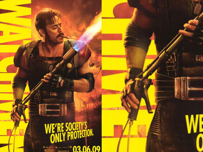 Watchmen (2009): Năm 2009, bộ truyện tranh Watchmen nổi tiếng của nhà văn Alan Moore và họa sĩ Dave Gibbons được đạo diễn Zack Snyder chuyển thể lên màn ảnh rộng. Dù nguyên tác sở hữu lượng người hâm mộ không nhỏ, phim vẫn gặp không ít khó khăn khi ra rạp. Doanh thu toàn cầu của Watchmen dừng chân ở mức 185 triệu USD, trong khi kinh phí Warner Bros. bỏ ra là 130 triệu USD. Bên cạnh nội dung, poster phim cũng khiến khán giả thích thú. Bức hình quảng bá nhân vật The Comedian trở nên hài hước khi súng tự phun lửa mà không cần bóp cò.