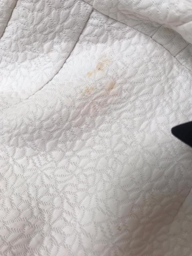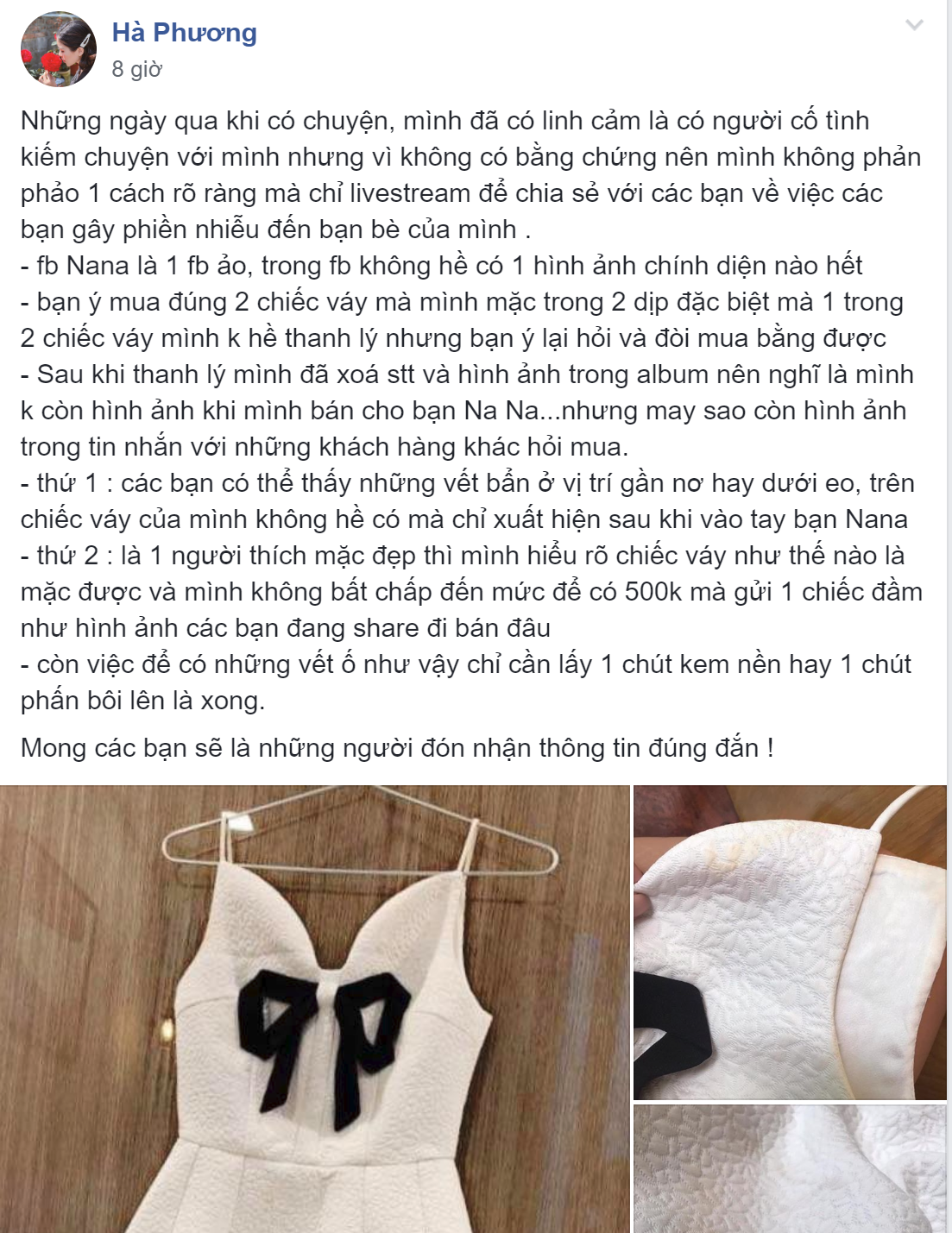 Chiếc váy trắng nhưng đã bị ngả màu vàng, ố, nhiều vết bẩn. Cảm thấy chiếc váy không xứng đáng với số tiền 500k, N.N đã nhắn tin thì Hà Phương giải thích: "Do chiếc váy màu trắng và chị để cũng lâu rồi, một năm trời rồi nên em giặt đi nhé. Chị cũng chỉ thanh lý 500 nghìn".