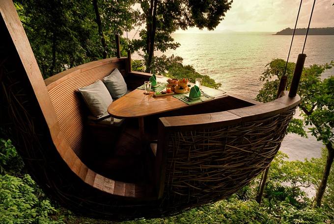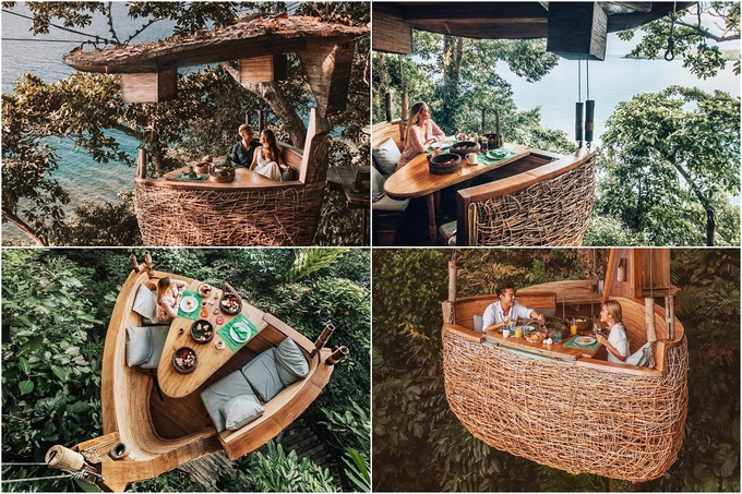 Điểm nhấn của khu nghỉ dưỡng này là dịch vụ dùng bữa trên cây. Khách ngồi lơ lửng trong một "tổ chim" có view ngắm biển, hòa cùng thiên nhiên. Cây cối rậm rạp bao phủ xung quanh khiến bạn có cảm giác như đang hóa thân thành Tarzan sống giữa rừng.