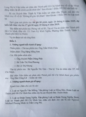 - Thời gian mở phiên tòa: 08 giờ 00 phút, Thứ hai 24 tháng 6 năm 2019 (Dự kiến phiên tòa sẽ kéo dài hai ngày)