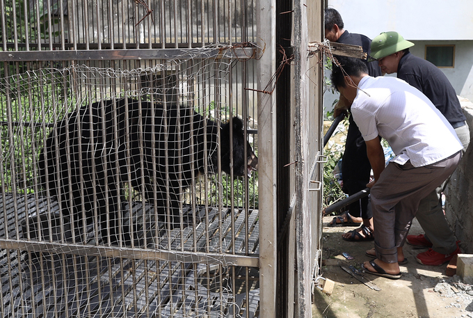 Nhân viên Trung tâm cứu hộ gấu Việt Nam tìm cách thân thiện với con vật và chuẩn bị chuyển nó sang chuồng chuyên dụng.