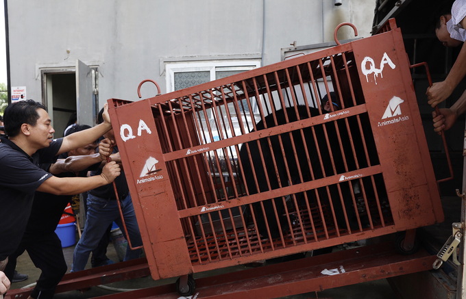 Nhân viên cứu hộ đưa con gấu lên xe tải. Trên quãng đường nhiều tiếng đồng hồ di chuyển, gấu sẽ được tiếp nước và thức ăn