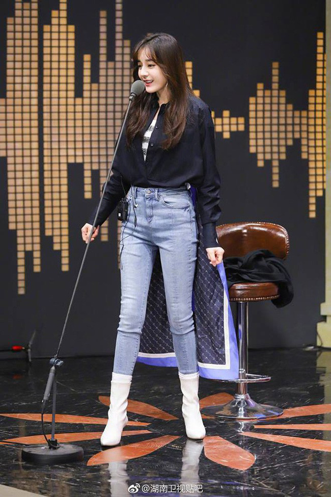 Địch Lệ Nhiệt Ba khéo khoe chân thon với quần jean cạp cao.