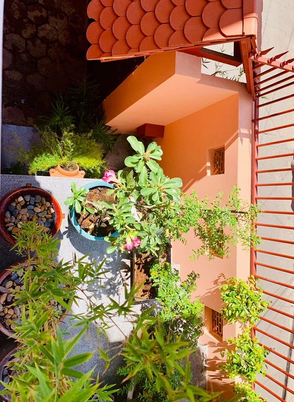 Bắt đầu từ cổng nhà, Thúy Nga đã trồng rất nhiều cây xanh. Đến cả cầu thang cũng được nữ diễn viên trưng dụng để đặt chậu cây.