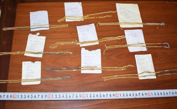 25 sợi dây chuyền mà Diệp cầm cố, qua giám định hàm lượng vàng chỉ có 1%, còn lại là bạc mạ vàng.