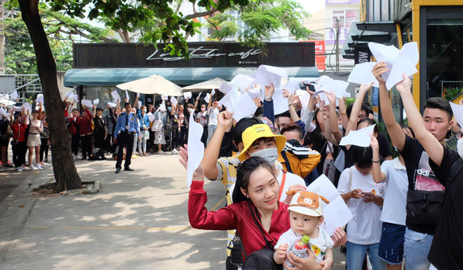 Ngay từ sáng sớm, hàng trăm fan đã xếp hàng, đội nắng, tranh nhau nhận vé gặp thần tượng. Thậm chí, một số người hâm mộ đã có mặt từ lúc 7h sáng, người bồng con, người đi từ Lái Thiêu vào Sài Gòn chỉ để được đứng hàng đầu và có được những tấm vé đầu tiên.