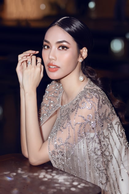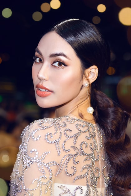 Tất cả đá sử dụng lần này đều được NTK sử dụng loại đá chấu với nhiều size khác nhau được nhập trực tiếp từ nước ngoài cùng thân lưới voan mềm mại tạo cảm giác phóng khoáng. Đôi hoa tai to bản cùng nhẫn kim cương làm những phụ kiện đắt giá làm tăng thêm phần đẳng cấp cho set đồ. Nhan sắc ngày càng rực rỡ, chín muồi của nữ siêu mẫu cùng trang phục thời thượng khiến cô tỏa sáng trong cả đêm tiệc.