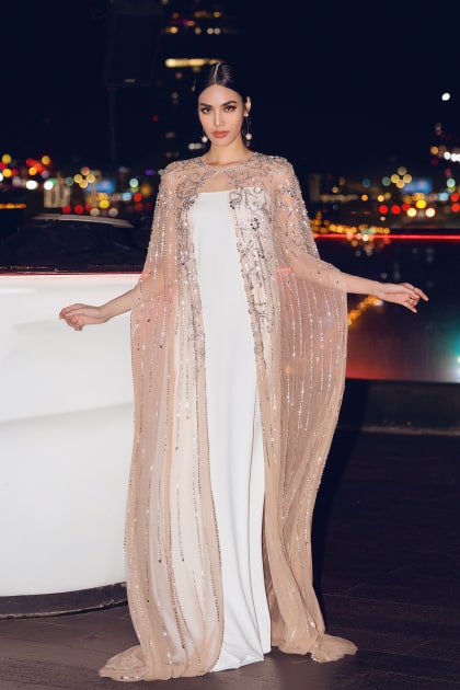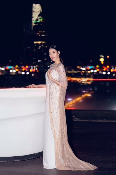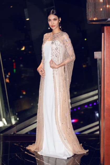 Đây là một sáng tạo mới nhất đến từ NTK Hà Thanh Huy. Cả hai đã cùng ngồi lại thảo luận để thống nhất ý tưởng cho sự xuất hiện lần này. Hà Thanh Huy bày tỏ anh muốn lột tả hết vẻ đẹp của người phụ nữ trong giai đoạn thai kỳ. Và không điều gì phù hợp hơn một chiếc áo choàng đính kết pha lê kết hợp với mẫu váy suông tối giản bên trong. Từng đường nét, họa tiết trên thân váy đều lấy cảm hứng từ cánh hoa bất tử được khéo léo cách điệu mang lại vẻ nhẹ nhàng, thanh thoát.