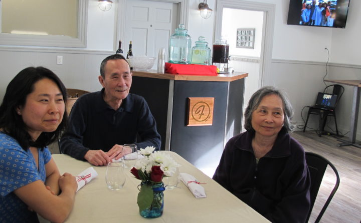 Eshia Đỗ cùng cha là ông Đỗ Phạm và mẹ bà Tăng Mùi tại buổi hội ngộ ở tiệm Frank Muff Bakery, Bangor ngày 8 tháng 6, 2019. (Judy Harrison/Bangor Daily News)