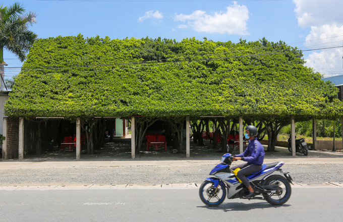 Quàn cà phê trên Quốc lộ 1A, gần ngã ba Bình Ảnh (huyện Thủ Thừa, Long An) khiến người đi đường chú ý bởi thiết kế lạ mắt. Bên ngoài quán nhìn như căn nhà, được tạo từ hàng chục cây si thay vì làm tường, lợp mái như bình thường.
