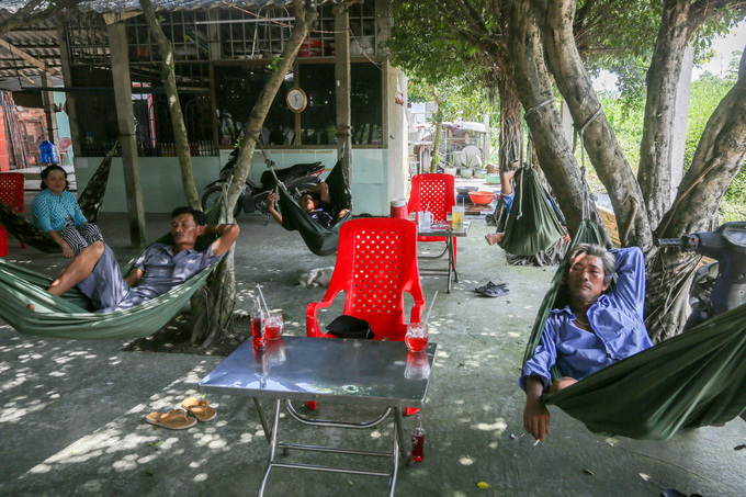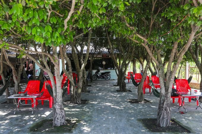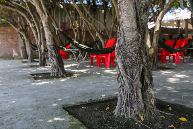 Bên trong quán rộng 250 m2, với 30 cây si trồng theo hàng lối. Quán bình dân, chỉ bộ bàn ghế và mắc võng cho khách đi đường ghé nghỉ ngơi.