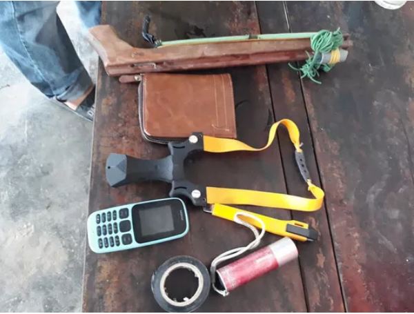 Lúc này, ông H. tri hô nhờ giúp đỡ nên người thân và dân làng đã bắt được 1 đối tượng, cùng 1 con chó, 1 bộ xung kích điện, súng tự chế và dao, tên còn lại đã nhanh chóng tẩu thoát bằng xe máy.