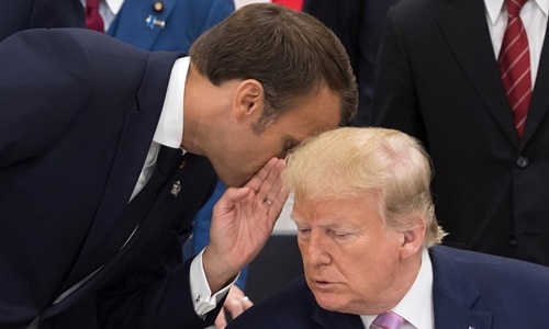 Tổng thống Pháp Macron nói thầm với Tổng thống Mỹ Trump tại G20 Nhật Bản ngày 28/6. Ảnh: AFP.