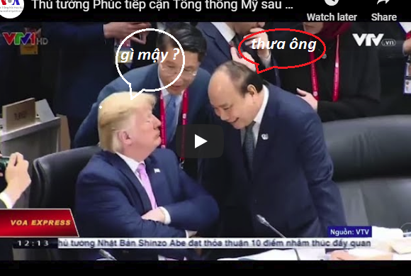 Vừa qua đài truyền hình quốc gia VTV có loan tải một đoạn phim phóng sự cho thấy cảnh Thủ tướng Việt Nam Nguyễn Xuân Phúc gặp gỡ Tổng thống Mỹ Donald Trump tại hội nghị G20 ở Nhật. Nhìn kỹ đoạn phim đó chúng ta có thể thấy được rất nhiều điều về văn hóa chính trị ở Việt Nam.