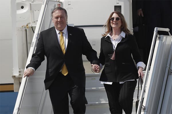 Ngoại trưởng Pompeo và vợ trong chuyến công du Lebanon hồi cuối tháng 3/2019. Ảnh: AP