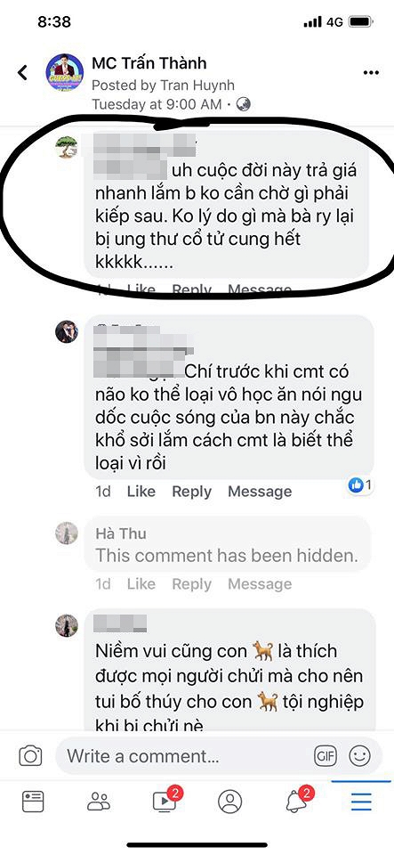 Tuy nhiên, có một anti-fan đã nguyền rủa vợ chồng anh khiến Trấn Thành vô cùng bức xúc. Cụ thể, trên fanpage của Trấn Thành, anti-fan này đưa ra những lời nói không hay khi đối đáp với fan của Trấn Thành: "Hai vợ chồng có nhiều tiền của đến đâu mà bà Ri bị ung thư cổ tử cung rồi cuối cùng cũng đem tiền đó vô cúng cho bác sĩ, không sai mà cuối cùng 2 vợ chồng son miết triệt nòi giống luôn không có ai hết", "Chưa nghe câu con cái là hạnh phúc của cha mẹ à. Vợ chồng thằng Xin Ri tham tiền làm chết xác cuối cùng cúng cho bác sĩ đó. Đời có vay có trả mà hè. Rất công bằng", "Cuộc đời này trả giá nhanh lắm, bạn không cần chờ gì đến kiếp sau. Không lý do gì mà bà Ri lại bị ung thư cổ tử cung hết", "Chờ tin bà Ri chuẩn bị xuống mồ sớm nhé...".