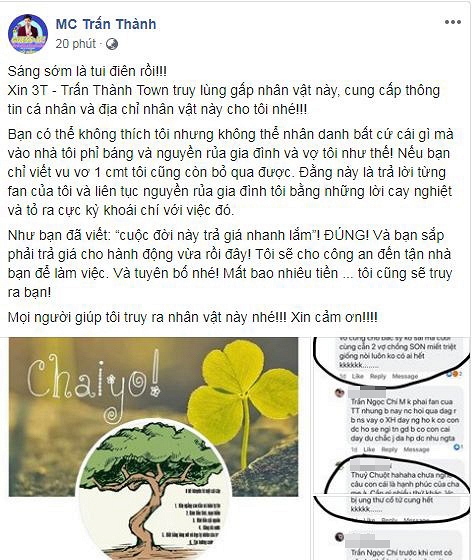 Mới đây, trên trang fanpage của mình, MC Trấn Thành bức xúc chia sẻ: "Sáng sớm là tui điên rồi! Xin 3T - Trấn Thành Town truy lùng gấp nhân vật này, cung cấp thông tin cá nhân và địa chỉ nhân vật này cho tôi nhé!