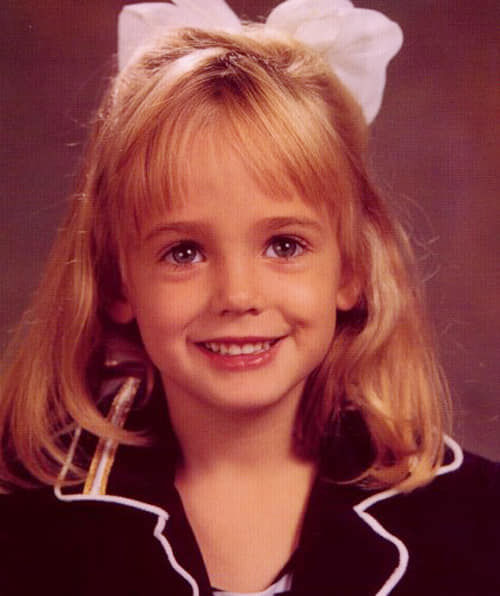 JonBenét Patricia Ramsey - Hoa hậu Nhí Mỹ dù mới chỉ 6 tuổi nhưng cô đã rất nổi tiếng. Cô bé có đôi mắt xanh và mái tóc vàng vô cùng xinh xắn. Cô chiến thắng ở các cuộc thi như Sắc đẹp nhí quốc gia như: Little Miss Charlevoix, Little Miss Colorado.