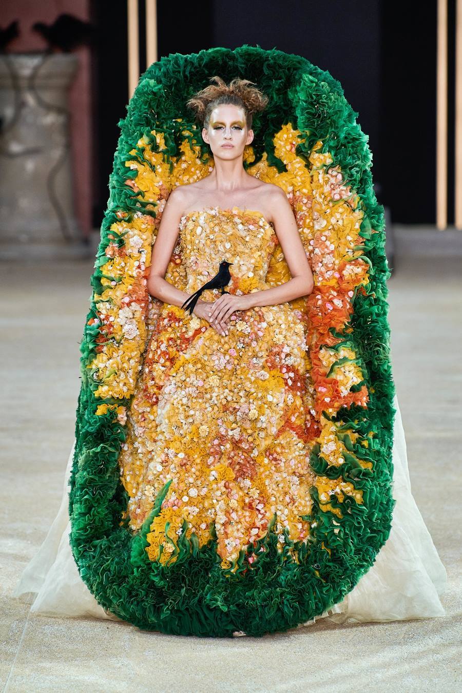 Thiết kế giống như một cỗ quan tài rực rỡ màu sắc khiến nhà thiết kế trẻ mất 7 năm để hoàn thành. Bộ đầm mô phỏng một xác ướp nằm yên trong cỗ quan tài xinh đẹp được trang trí như một khu vườn với hai màu vàng, xanh. Chất liệu được dùng chính là vải tuyn. Những bông hoa rực rỡ sắc vàng, xanh cũng tiêu tốn 100 giờ của những người thợ lành nghề.