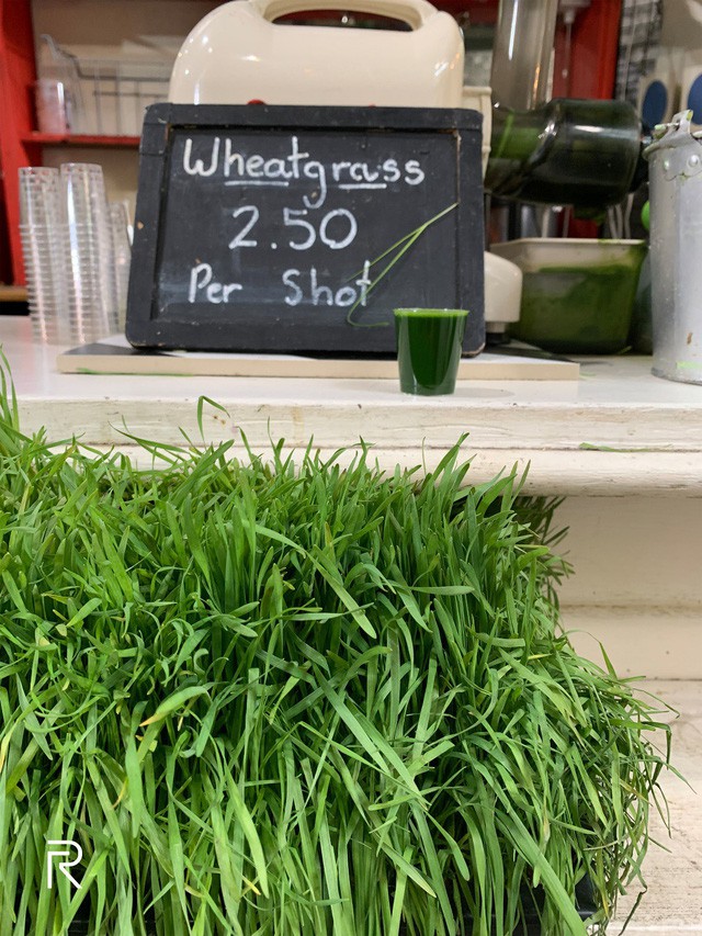 Một đặc sản ở đây là cỏ ngọt wheatgrass, £2.5/1 shot như trong hình