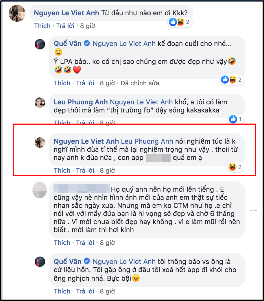 Theo đó, khi trò chuyện cùng Quế Vân và Lều Phương Anh trên trang cá nhân, Việt Anh khẳng định hình ảnh anh đăng tải đã thông qua phần mềm chỉnh sửa nên mới khác lạ tới vậy. "Nói nghiêm túc là không nghĩ mình đùa tí thế mà lại nghiêm trọng như vậy, thôi từ nay anh không đùa nữa", Việt Anh nói.