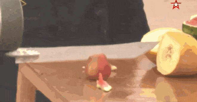 Kết quả là lưỡi kiếm gắn trên xe tăng đã bổ đôi quả dưa hấu, một quả lê và một quả táo. Tất cả những đường cắt đều rất ngọt và chỉ mất chưa đầy vài giây để cắt xong.