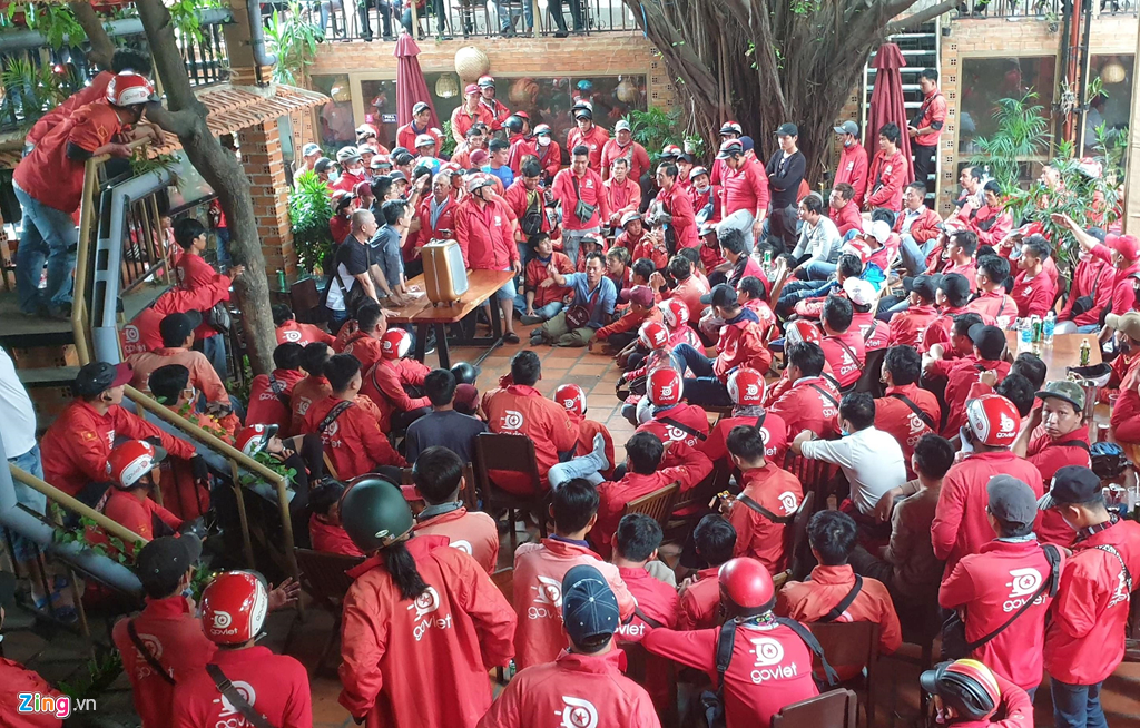 Chiều 18/7, khoảng 300 tài xế công nghệ Go-Viet tắt ứng dụng, ngồi vây quanh người đại diện của hãng tại quán cà phê ở quận 7 (TP.HCM), nghe giải thích về chính sách mới liên quan đến điểm thưởng cho tài xế.