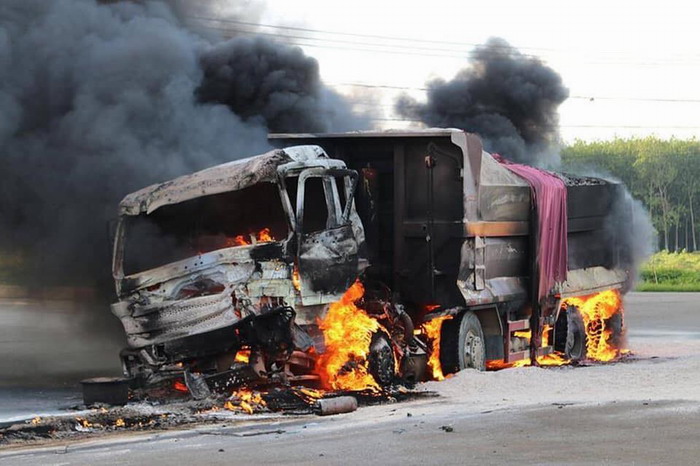 Xe bồn chở dầu mang biển kiểm soát (BKS) quân đội và xe ben chở cát va chạm tại vòng xoay Đức Mỹ (H.Châu Đức, Bà Rịa - Vũng Tàu). Cú va chạm khiến hai xe bốc cháy dữ dội.