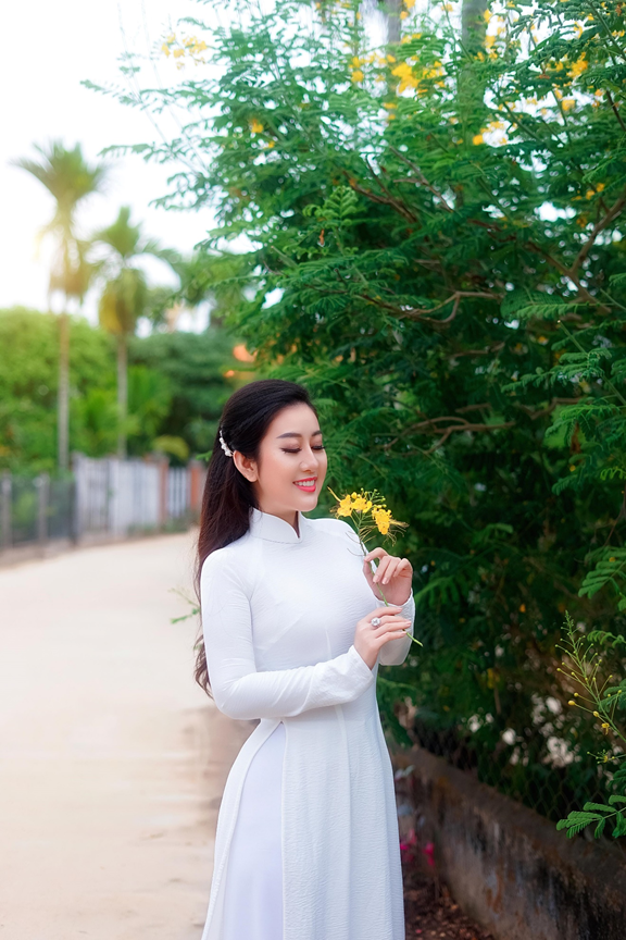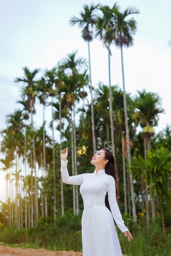 Với thân hình thon gọn, mảnh mai, trang phục áo dài trắng cùng mái tóc đẹn xõa dài truyền thống càng giúp cô tôn lên được vẻ đẹp quyến rũ của mình.