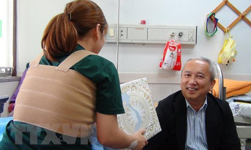 Đại sứ Nguyễn Vũ Tú thăm cô dâu Việt ở bệnh viện ngày 17/7. Ảnh: TTXVN.