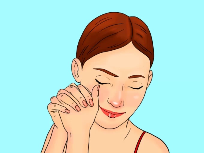 Đan hai tay vào nhau, ngón cái giữ thẳng. Đặt đầu ngón cái tay phải dưới mắt trái, vừa ấn nhẹ vừa trượt về phía tai. Sau đó, trượt tiếp ngón cái từ tai xuống xương đòn. Lặp lại động tác cuối hai lần.