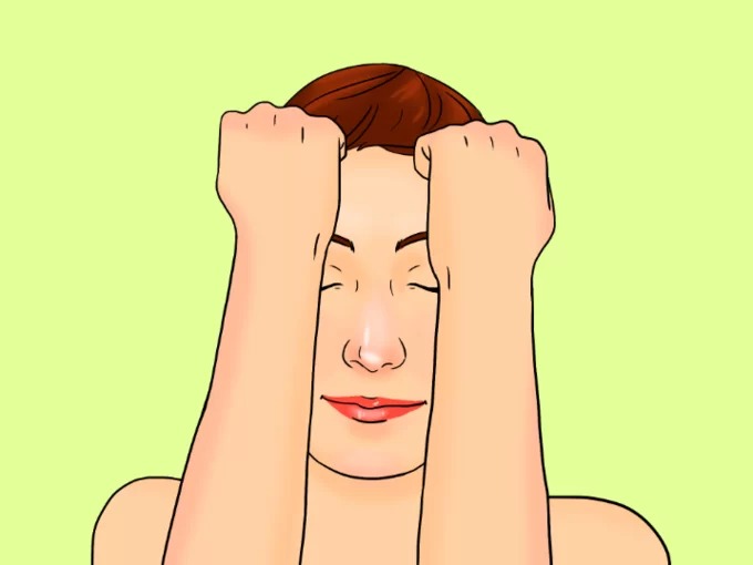 Giữ nguyên nắm tay hờ, di từ phần đỉnh trán gần đường chân tóc xuống thái dương và dái tai. Sau đó đưa tay đi xuống cổ cho tới khi chạm xương quai xanh (xương đòn).