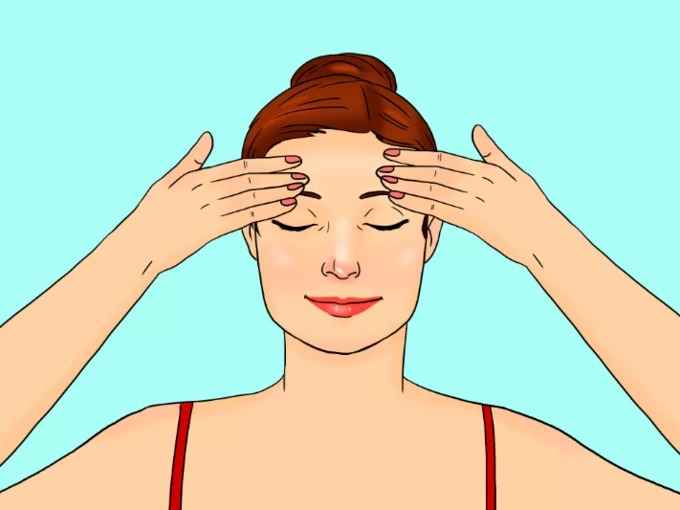Tay nắm lại, đặt trên lông mày, di lên trên trán. Đưa tay về cách vị trí ban đầu một chút rồi lặp lại động tác để làm mịn toàn bộ bề mặt trán.