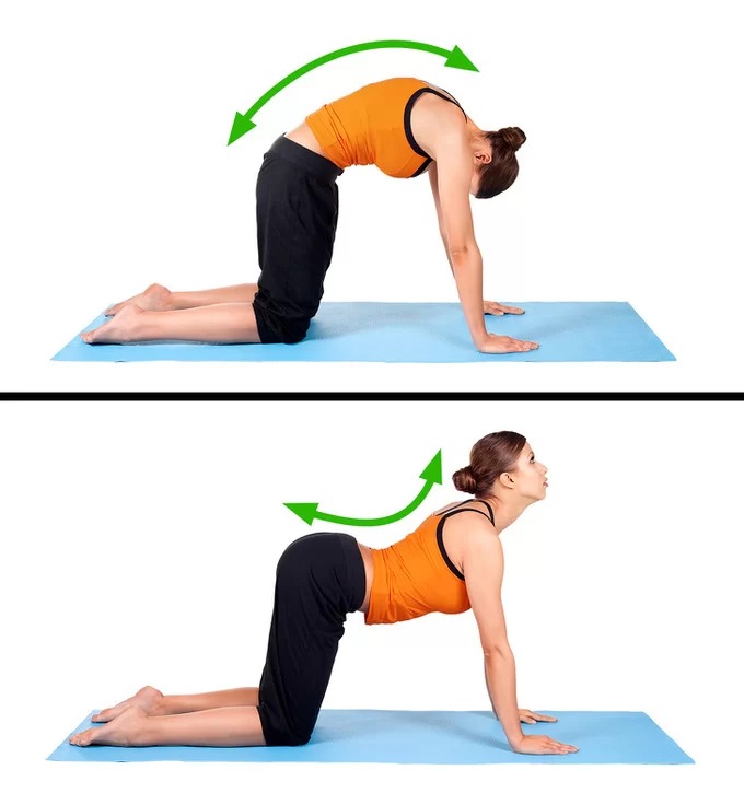 Chuẩn bị ở tư thế quỳ gối, chống tay trên thảm. Hít vào, cúi đầu xuống thấp, đẩy lưng lên cao hết sức có thể. Giữ trong 5 giây rồi từ từ thở ra, ngẩng cao đầu, hạ thấp lưng xuống. Lặp lại động tác 8 lần.