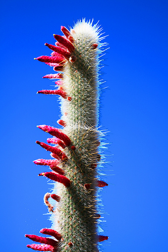 Không những có cái tên khá hay mà loài xương rồng này còn rất đặc biệt. Lớp gai mọc trên thân nó là màu trắng chứ không phải xanh hay nâu. Hơn nữa, nhìn những phần màu đỏ nhô ra từ thân nó hẳn sẽ chẳng ai nghĩ chúng là hoa. Những bông hoa không mọc hướng lên trên mà đâm thẳng sang ngang.