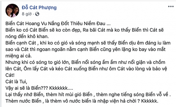 Cát Phượng bất ngờ bóng gió nói lời ngôn tình cho tình trẻ. Điều này khiến nhiều người thích thù. Cô đã mượn hai hình ảnh cát và biển để nói lên nỗi lòng của chính mình.