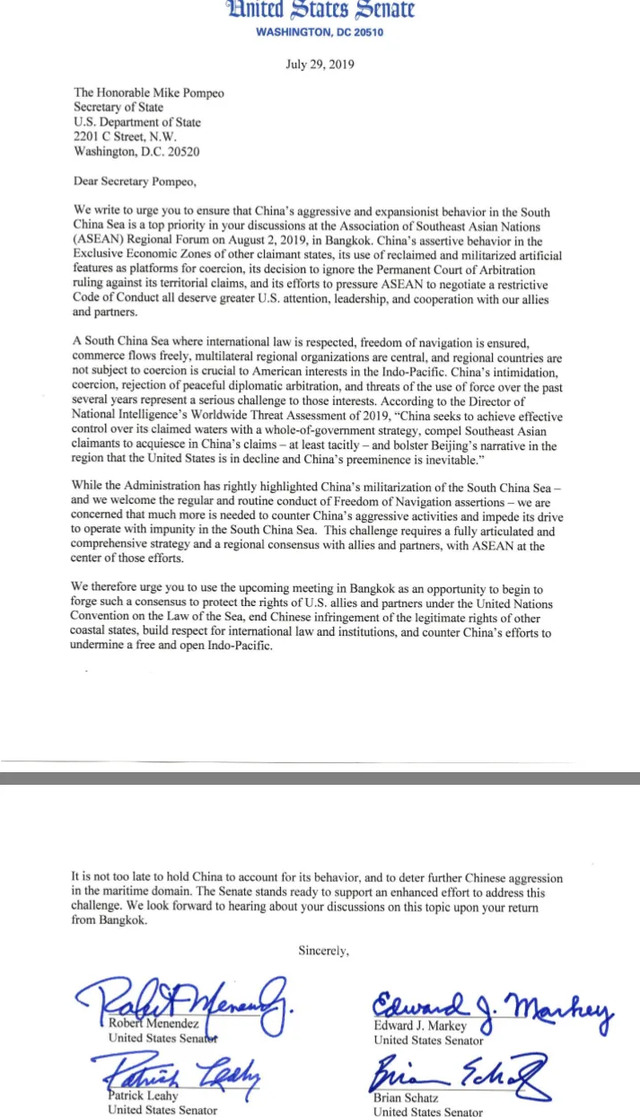 Thượng nghị sĩ Bob Menendez (bang New Jersey), thành viên cấp cao của Ủy ban Đối ngoại Thượng viện, cùng Thượng nghị sĩ Ed Markey (Massachusetts), Thượng nghị sĩ Patrick Leahy (Vermont) và Thượng nghị sĩ Brian Schatz (Hawaii) đă cùng nhau gửi một bức thư tới Ngoại trưởng Mike Pompeo, kêu gọi chính quyền Tổng thống Donald Trump hành động nhiều hơn để ngăn chặn sự gây hấn của Trung Quốc tại Biển Đông. Cả 4 thượng nghị sĩ đều đặt bút kư vào bức thư này.