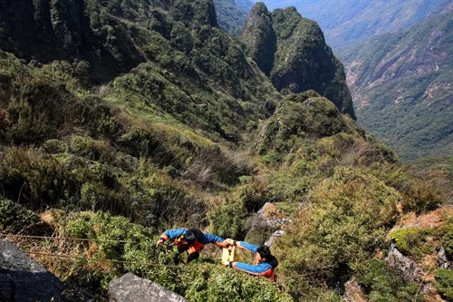 Các thành viên trong tổ đang đu mình dọc sườn núi để dọn rác cho nóc nhà Đông Dương.